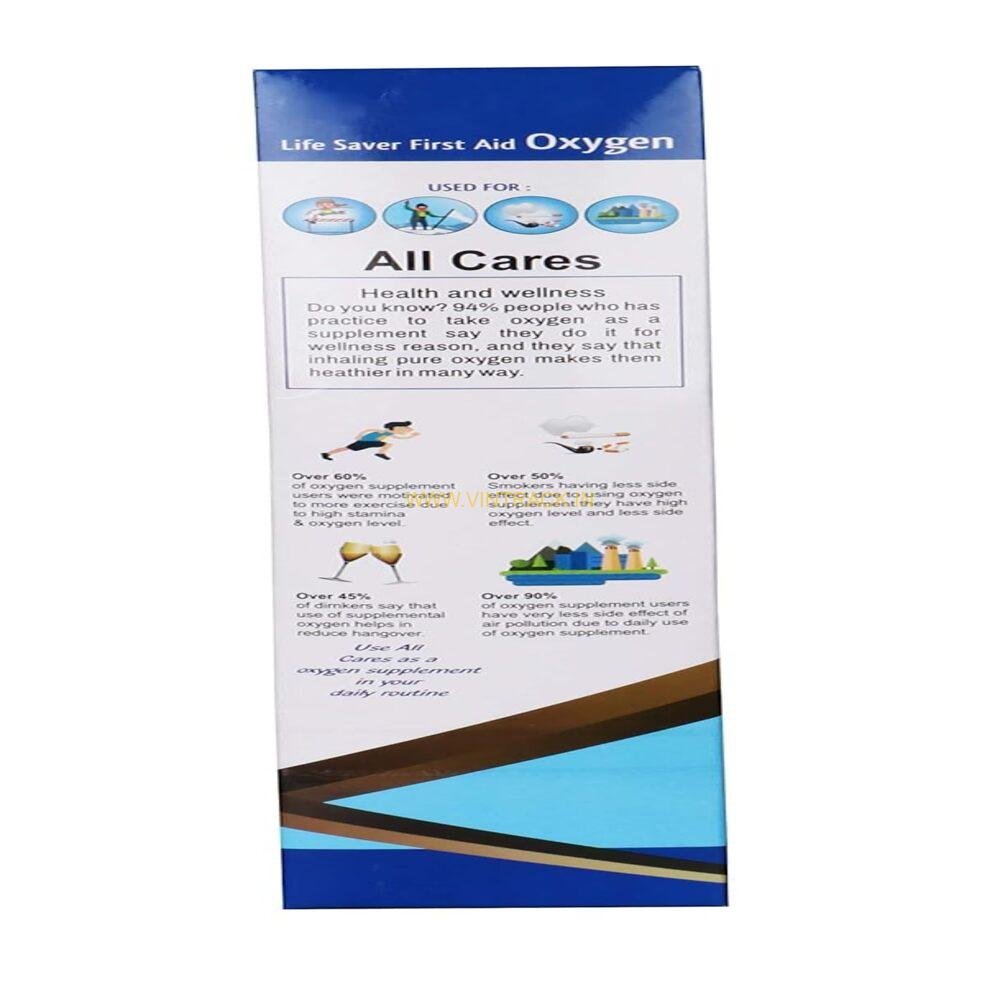 Breathe easy anytime with the All Cares Oxygen Can 12 Litres with Built-in Mask. This portable emergency oxygen cylinder provides instant supplemental oxygen for health, travel, outdoor activities, and sports. Compact, lightweight, and easy to use, it ensures reliable oxygen supply wherever you need it.